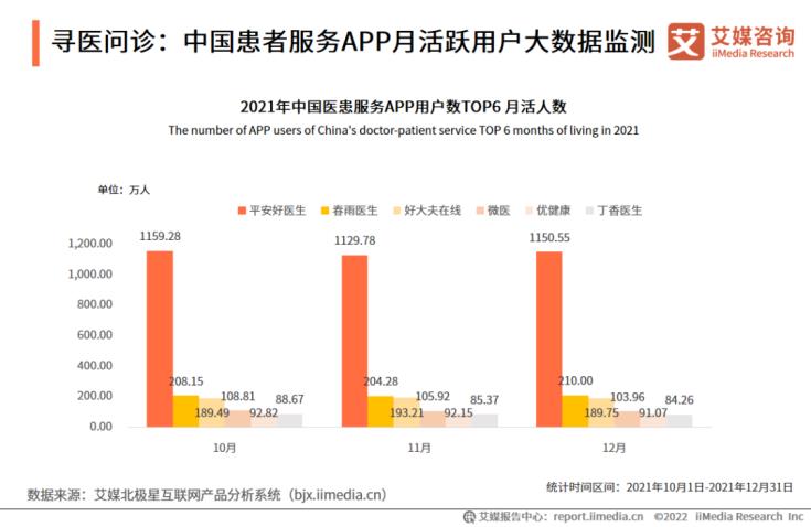 iiMedia Research(艾媒咨詢)數(shù)據(jù)顯示,2021年10-12月綜合患者服務(wù)的移動(dòng)產(chǎn)品中,活躍用戶數(shù)前五名分別為:平安好醫(yī)生、春雨醫(yī)生、好大夫在線、微醫(yī)和優(yōu)健康。其中,平安好醫(yī)生月度活躍用戶數(shù)以超過(guò)第二位五倍多的差距領(lǐng)先同行。
