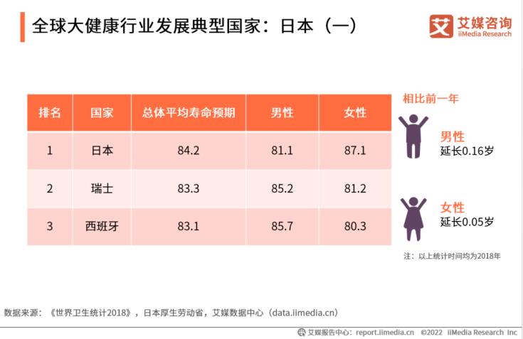 世界衛(wèi)生組織在日內(nèi)瓦發(fā)布最新報(bào)告《世界衛(wèi)生統(tǒng)計(jì)2018》,在各國(guó)預(yù)期平均壽命排名中,日本蟬聯(lián)第一,達(dá)到84.2歲,其中女性壽命預(yù)期為87.1歲,男性為81.1歲。日本厚生勞動(dòng)省發(fā)布報(bào)告,顯示日本女性人均預(yù)期壽命2018年相比前一年延長(zhǎng)0.05歲,男性延長(zhǎng)0.16歲。艾媒咨詢分析師認(rèn)為,日本作為長(zhǎng)壽人口最多的國(guó)家,人們對(duì)健康的意識(shí)較高,對(duì)大健康相關(guān)產(chǎn)品服務(wù)需求量較大,大健康行業(yè)在日本有著較廣闊的發(fā)展空間。