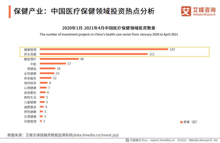 iiMedia Research(艾媒咨詢)數(shù)據(jù)顯示,2020年1月-2021年4月期間,中國醫(yī)療保健類投資項目數(shù)分布中,健康管理與養(yǎng)生保健處于投資熱度的第一梯隊,其次是康復(fù)理療、中醫(yī)和保健品。