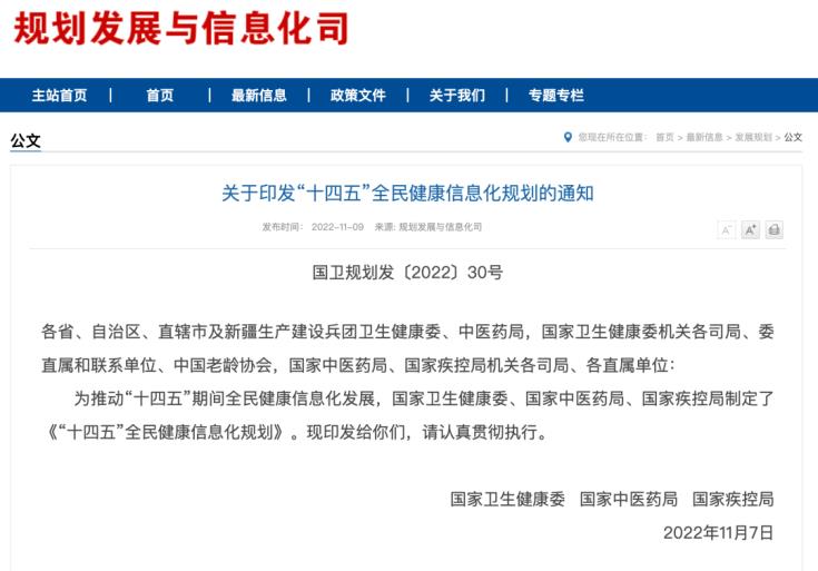 2022年11月9日,國家衛生健康委、國家中醫藥局、國家疾控局對外發布《“十四五”全民健康信息化規劃》。