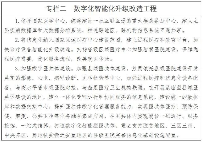 為把《規劃》落細落實,在確保安全的前提下,聚焦信息化建設過程中存在的重點難點問題,堅持問題導向、需求導向和應用導向,通過實施全民健康信息新基建、數字化智能化升級改造等一系列重大工程與開展互通共享三年攻堅、健康中國建設等一系列優先行動,為信息化任務落地落實提供強有力抓手。