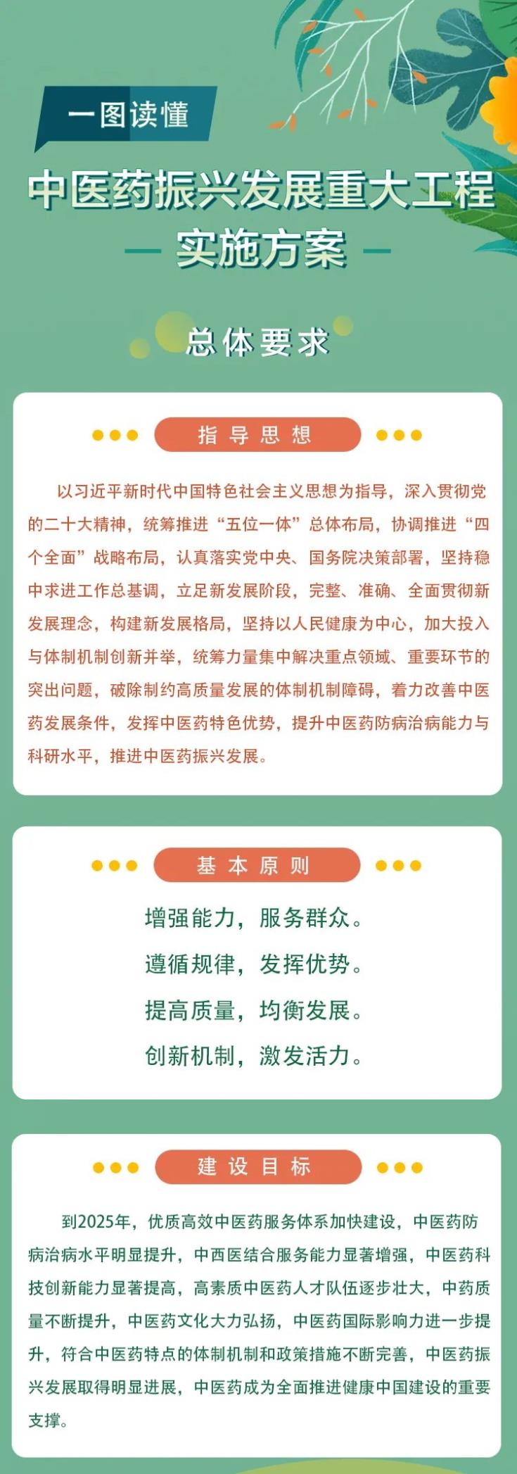 《方案》從中醫藥健康服務高質量發展工程、中西醫協同推進工程、中醫藥傳承創新和現代化工程、中醫藥特色人才培養工程(岐黃工程)、中藥質量提升及產業促進工程、中醫藥文化弘揚工程、中醫藥開發發展工程、國家中醫藥綜合改革試點工程、保障措施九大方面全面闡述國家對中醫藥振興發展的措施。