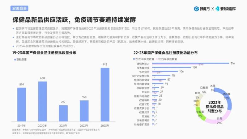 ?據(jù)國(guó)家市場(chǎng)監(jiān)督管理總局?jǐn)?shù)據(jù)顯示,我國(guó)國(guó)產(chǎn)保健食品在2023年注冊(cè)獲批的總數(shù)達(dá)到913款,同比增長(zhǎng)155%,獲批數(shù)量達(dá)近5年新高,表明保健食品行業(yè)在監(jiān)管規(guī)范、審批效率等方面取得顯著進(jìn)展,行業(yè)發(fā)展呈積極態(tài)勢(shì)。