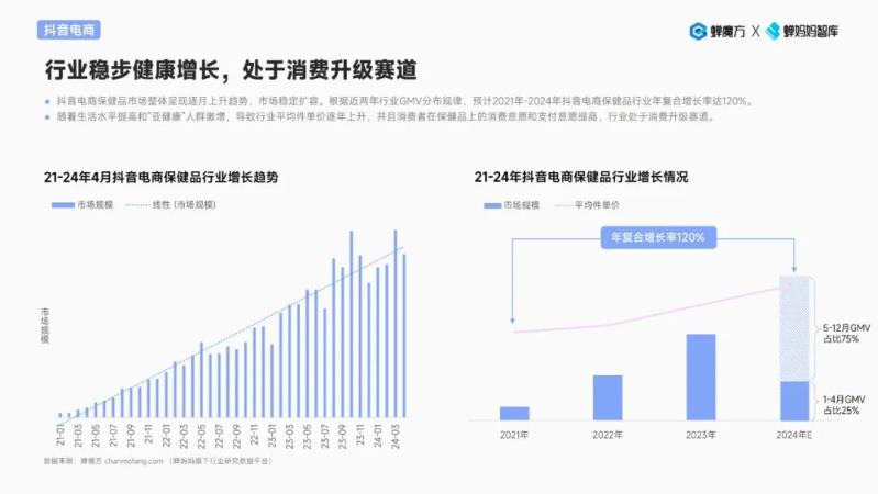 ? 抖音電商保健品市場(chǎng)整體呈現(xiàn)逐月上升趨勢(shì),市場(chǎng)穩(wěn)定擴(kuò)容。根據(jù)近兩年行業(yè)GMV分布規(guī)律,預(yù)計(jì)2021年-2024年抖音電商保健品行業(yè)年復(fù)合增長(zhǎng)率達(dá)120%。