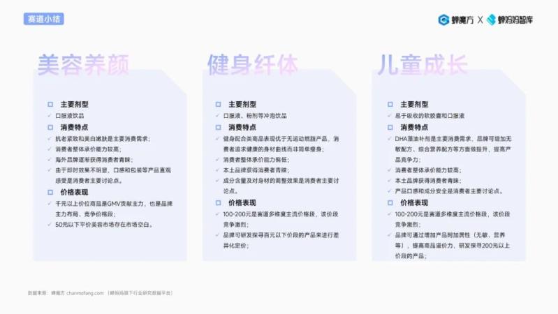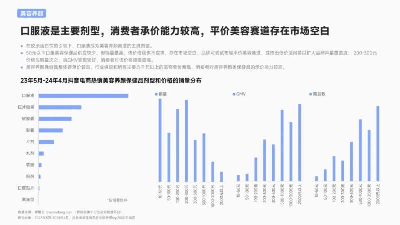 ? 50元以下口服美容保健品供應(yīng)較少,但銷量最高,該價(jià)格段供不應(yīng)求,存在市場(chǎng)空白,品牌可嘗試布局平價(jià)美容賽道,或推出低價(jià)試用裝以擴(kuò)大品牌聲量覆蓋度;200-300元價(jià)格段銷量次之,且GMV表現(xiàn)較好,消費(fèi)者對(duì)該價(jià)格接受度高。