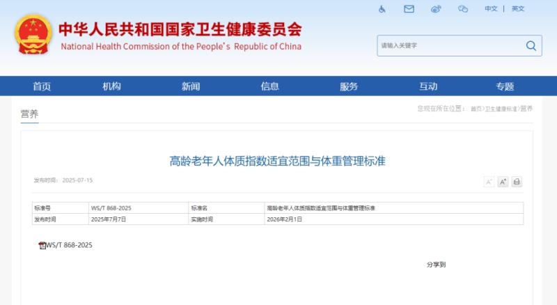 近日,國家衛(wèi)健委發(fā)布了行業(yè)標準《高齡老年人體質(zhì)指數(shù)適宜范圍與體重管理標準》,從體質(zhì)指數(shù)指標策略以及體重管理兩大方面的七項細則出發(fā),為高齡老人的體重管理提出了具備參考性的行業(yè)標準。