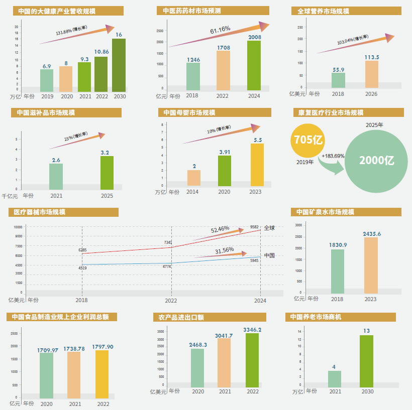 2022年我國大健康產業(yè)規(guī)模超過10萬億。到2030年,我國健康產業(yè)規(guī)模將提升至16萬億元,2024年大健康產業(yè)將進入高速發(fā)展的“黃金時期”。